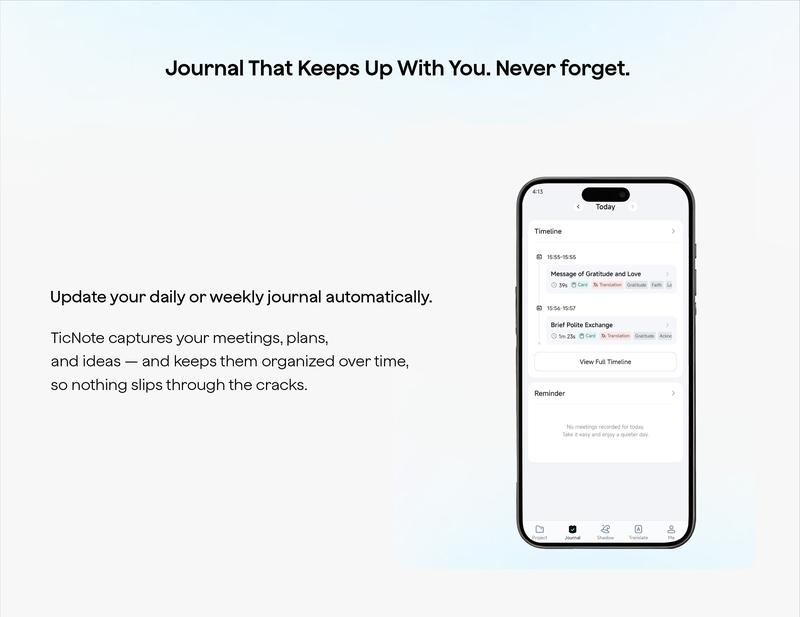 - Journal: The core functionality of Journal is particularly useful for situations where you have recorded multiple audio segments using an app like TicNote but find it inconvenient to review each one. This feature allows you to directly review your recordings. It can generate summaries for you and even provide daily or weekly recaps of your meeting content. Furthermore, it helps extract actionable items or todos and can add them directly to your reminder list, greatly enhancing the convenience of using AI-powered audio recording.